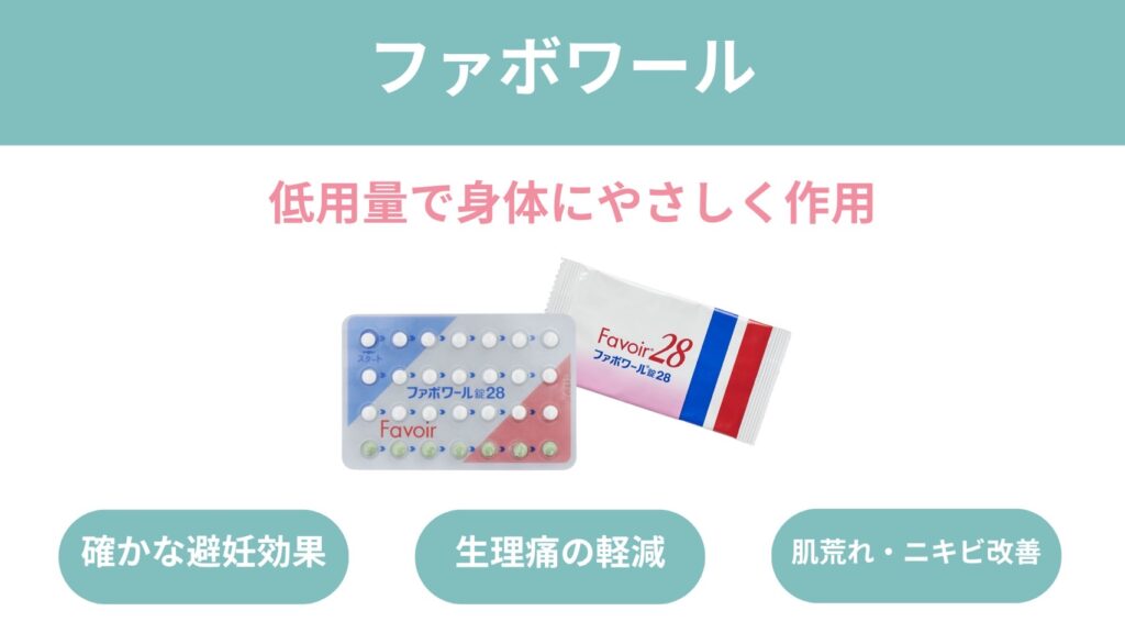 ファボワールは、卵胞ホルモン(エチニルエストラジオール)と黄体ホルモン(ドロスピレノン)を含む低用量ピルです。